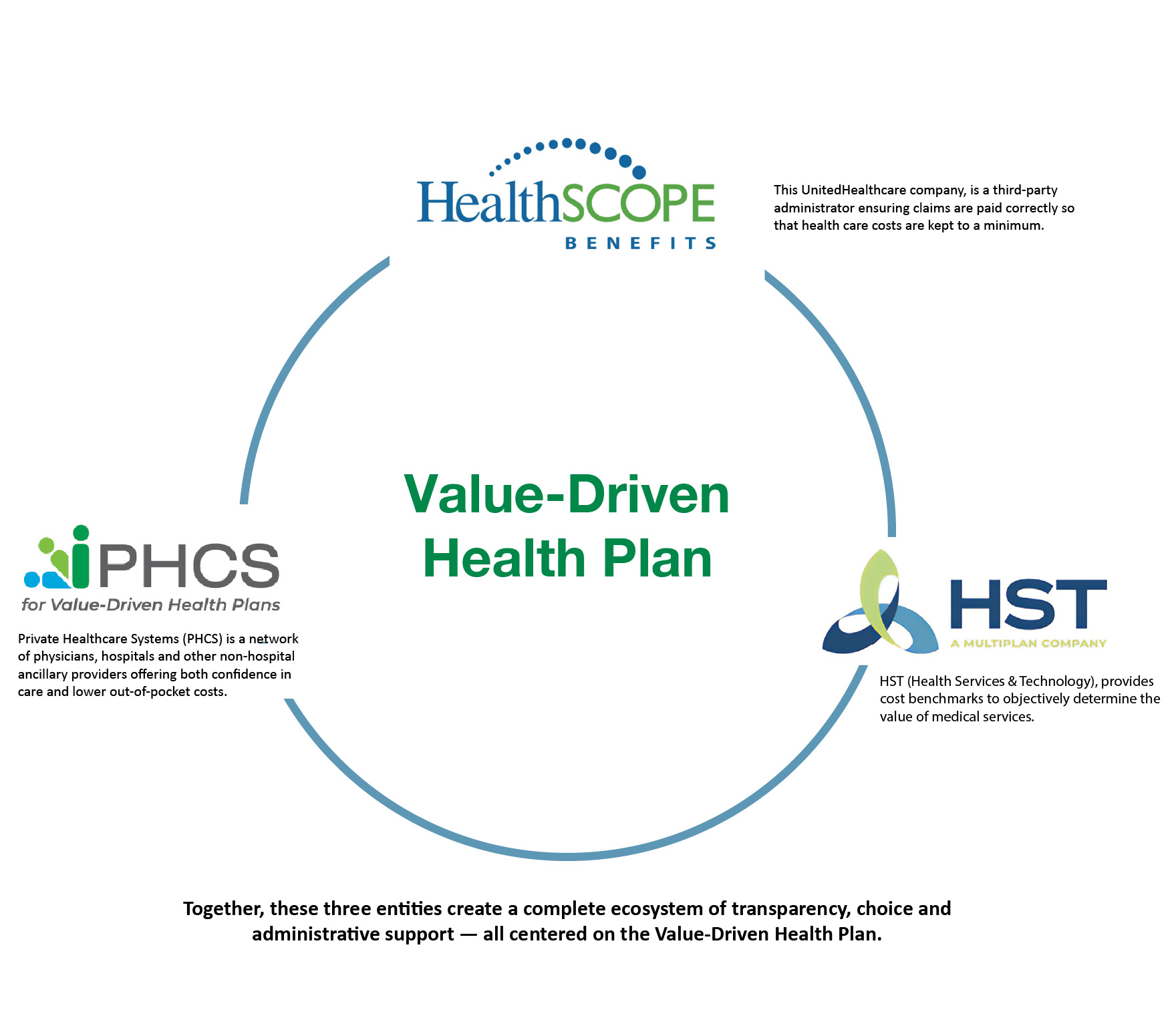 The Value-Driven Health Plan works by bringing together three key components. Each plays a unique role in delivering transparent, flexible, and supportive health care services.